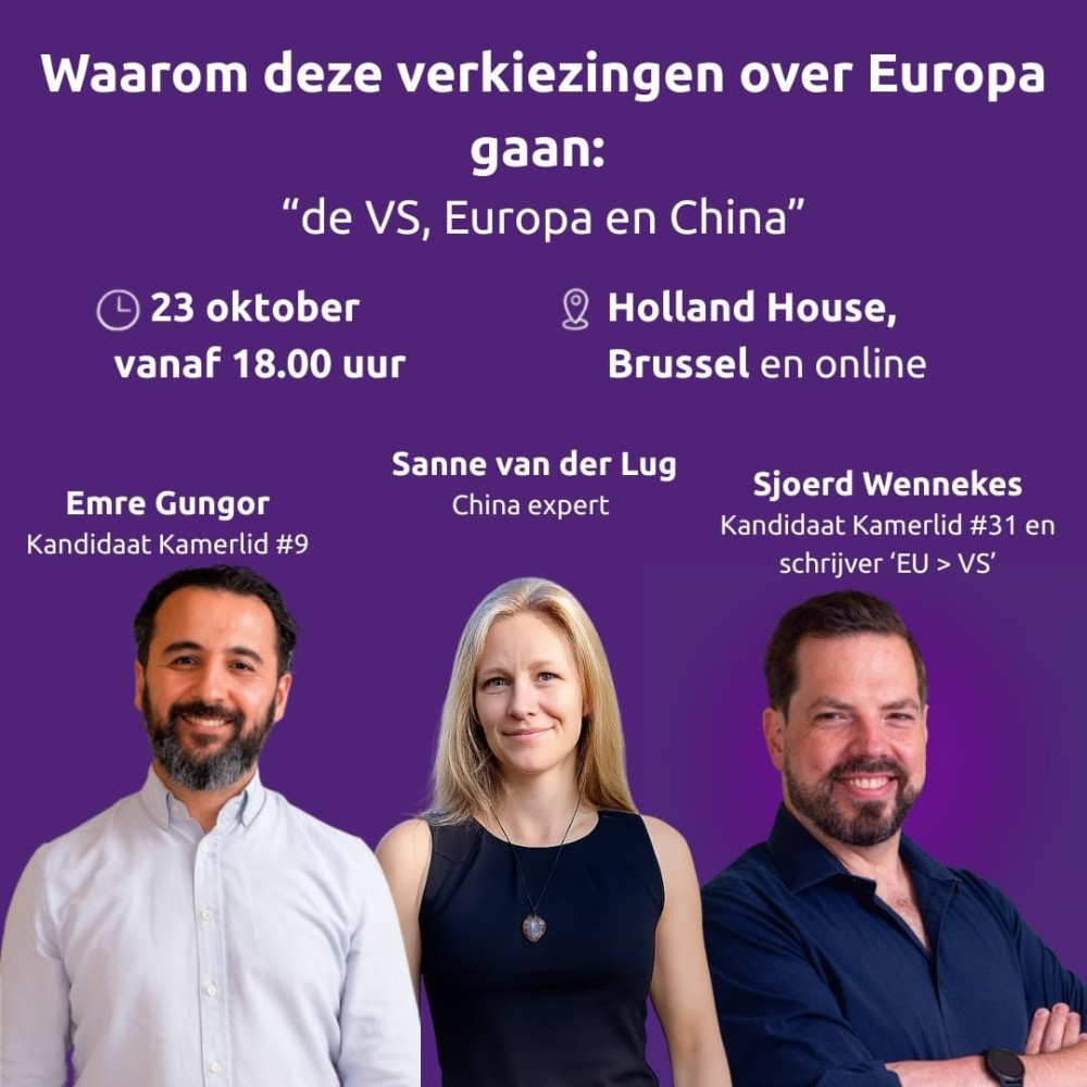We gaan in gesprek met Volt TK-kandidaat Emre Gungor (nr. 9), schrijver van het boek EU > VS en Volt TK-kandidaat Sjoerd Wennekes (nr. 31) en China-deskundige Sanne van der Lugt. We gaan praten over het thema: “Waarom deze verkiezingen over Europa gaan: de VS, Europa en China.”