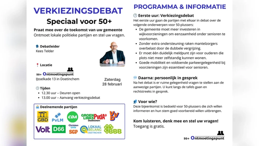 Tijdens het debat gaan vertegenwoordigers van negen politieke partijen met elkaar in gesprek over de toekomst van het ouderenbeleid in Doetinchem, aan de hand van vier prikkelende stellingen.