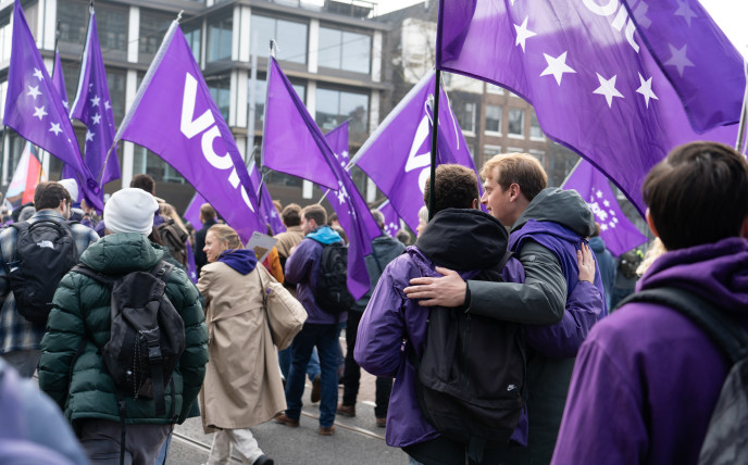 Daarom kiest Volt voor een samenleving die liefde boven angst zet. Waarin we verschillen omarmen. En waar mensenrechten altijd voorop staan. We stellen een minister voor Discriminatiebestrijding, Inclusie en Gelijkwaardigheid aan. We bestrijden discriminatie in het onderwijs, de zorg, op het werk en op de woningmarkt. Haatmisdrijven worden zwaarder bestraft, óók als deze online plaatsvinden. Jouw salaris mag nooit afhangen van je gender, afkomst of seksuele voorkeur. We versterken de positie van lhbtqia+'ers, vrouwen en regenbooggezinnen. We kiezen voor verbinding in plaats van verdeeldheid. Voor liefde in plaats van angst.