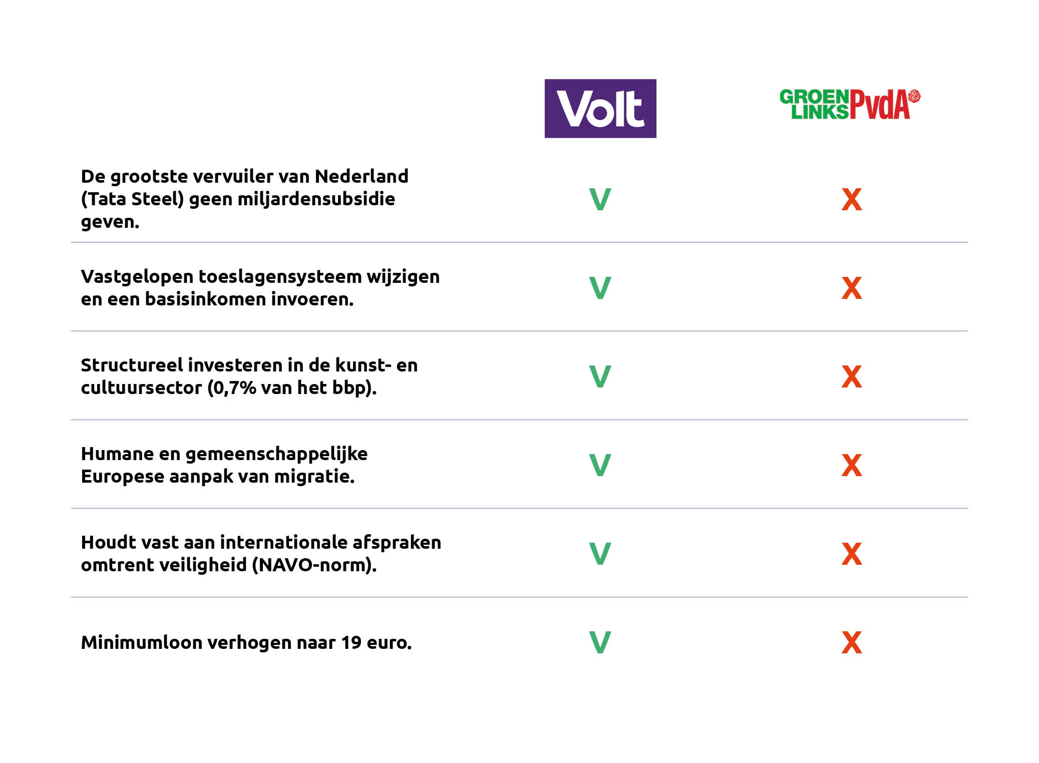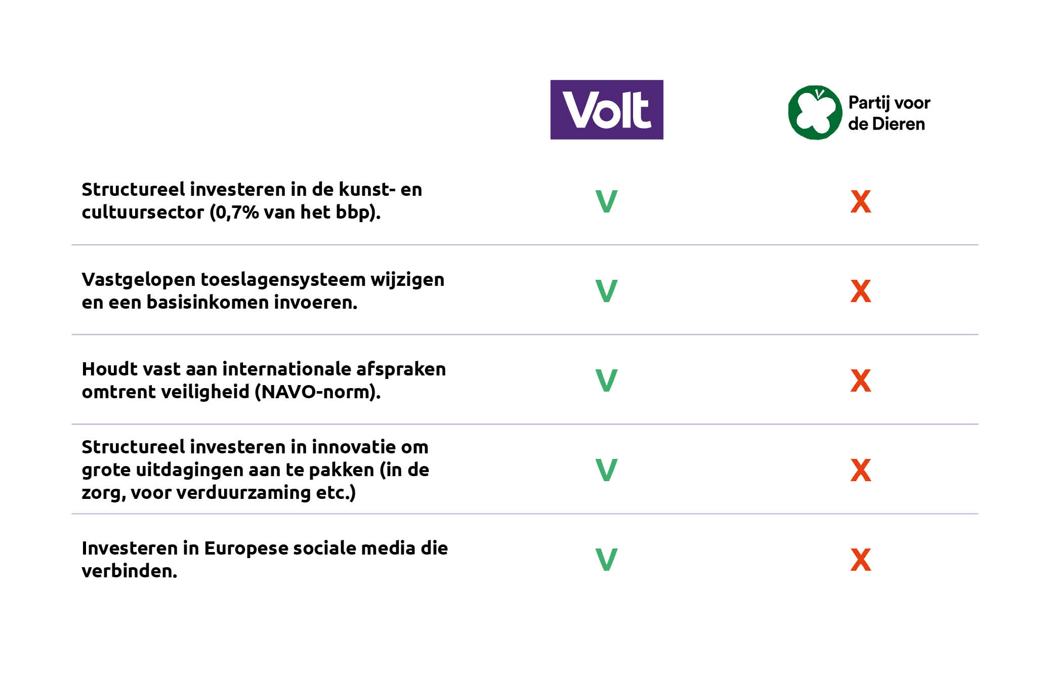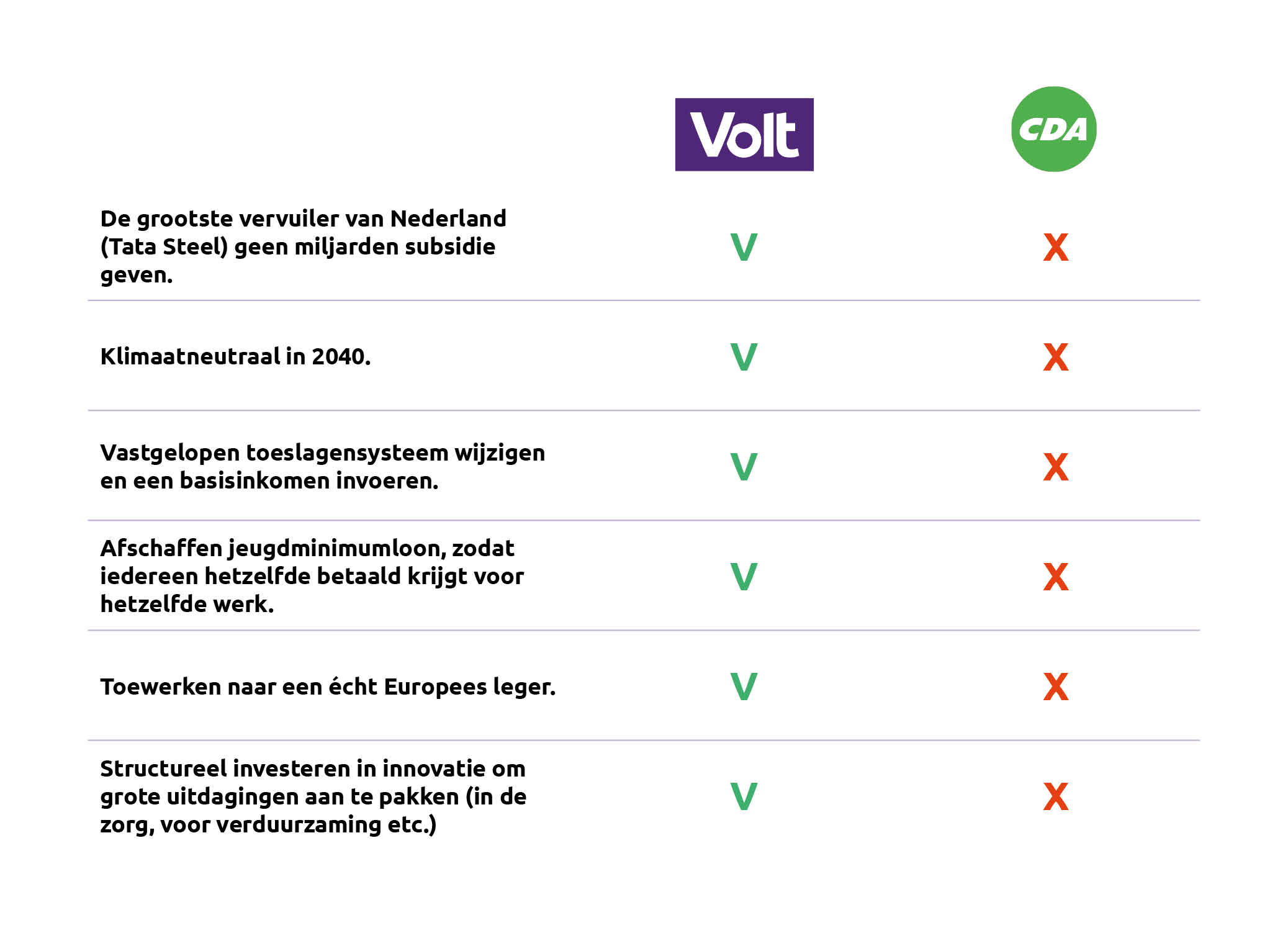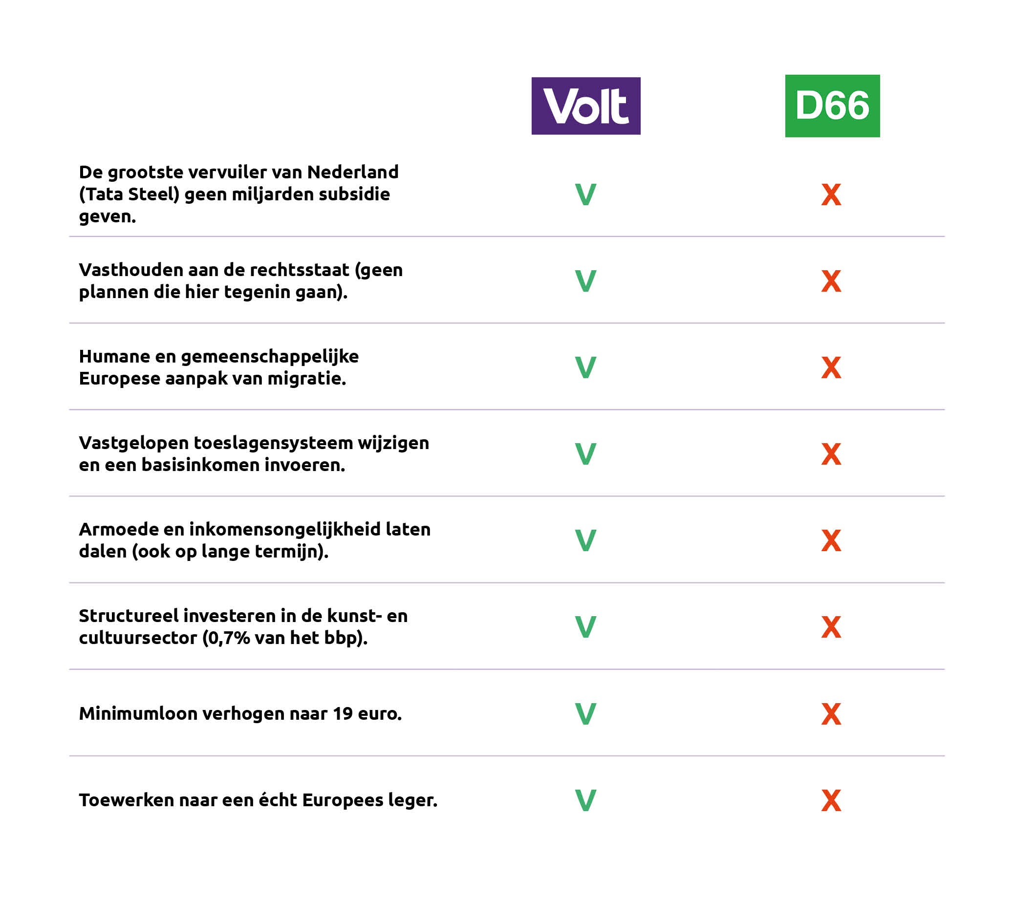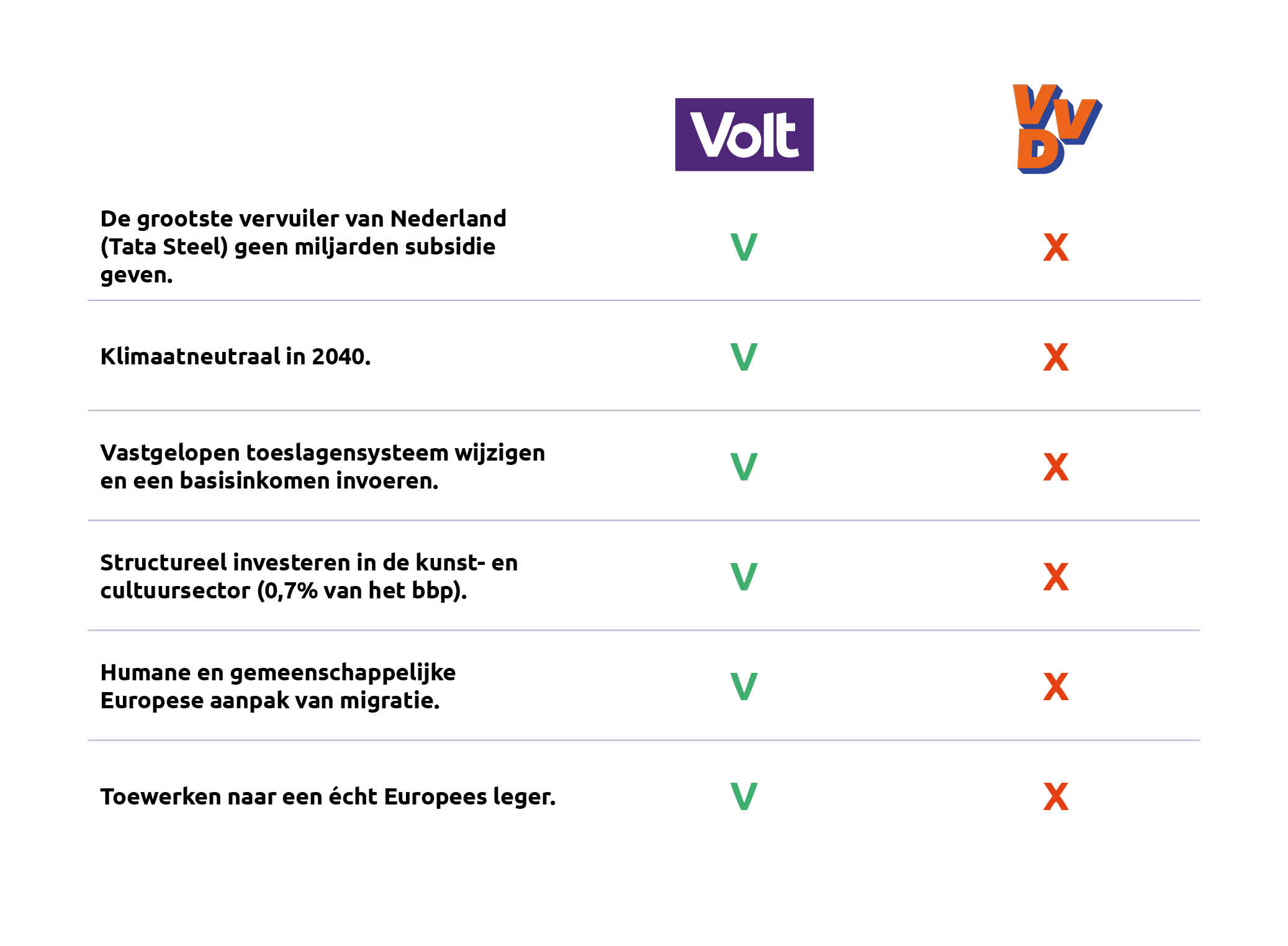 Twijfel je nog tussen een stem op Volt of op een andere partij? Wij geven je hier een overzicht met enkele belangrijke verschillen tussen Volt en GroenLinks-PvdA, D66, Partij voor de Dieren, CDA en VVD. Ons belangrijkste stemadvies: volg je hart. Je idealen. Dan stem je het beste. Wij hopen onderdeel te worden van een progressieve coalitie. Help ons daar te komen!