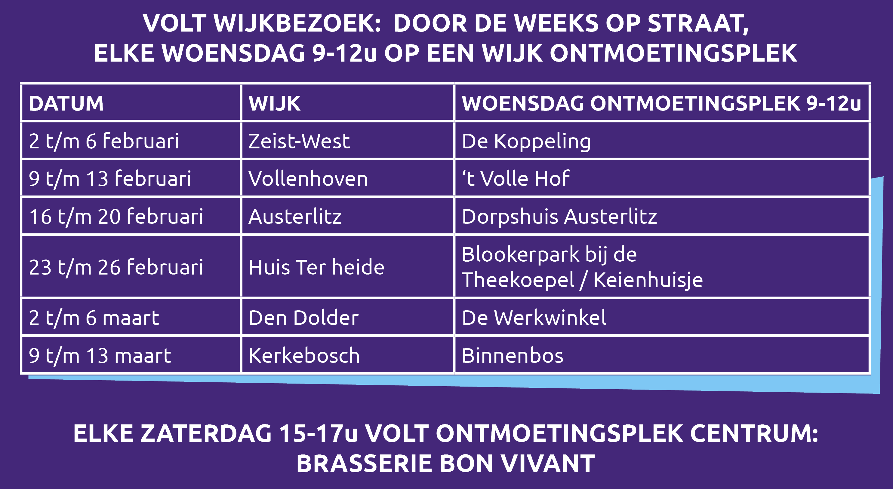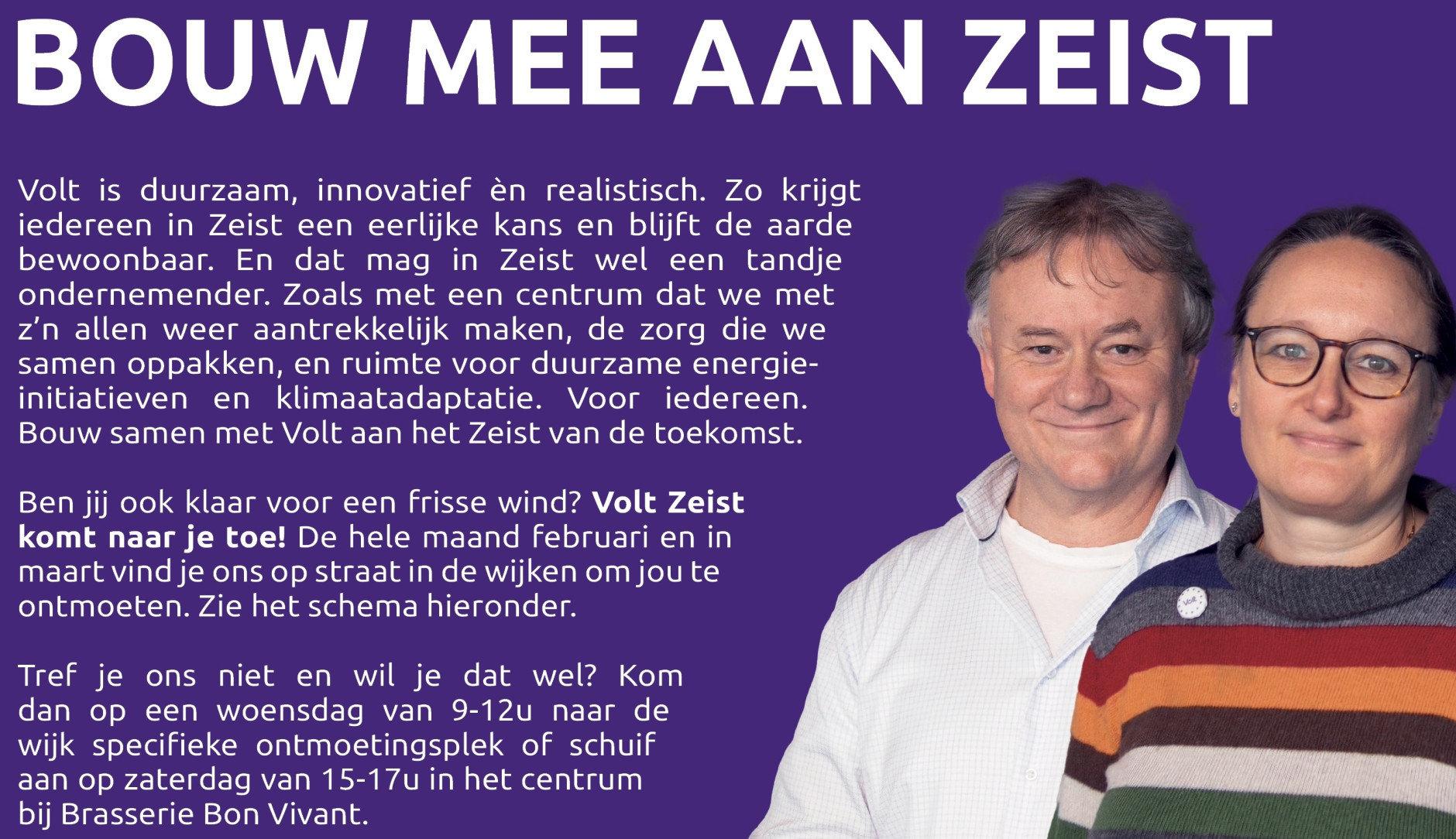 Volt Zeist komt naar je toe! Elke week vanaf 2 februari zijn we in een andere wijk en elke zaterdag vanaf 7 februari in het centrum. Ontmoet ons en bouw mee aan Zeist.