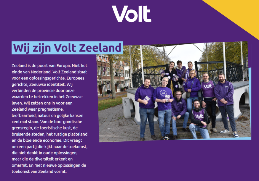 Zeeland is de poort van Europa, niet het einde van Nederland. Volt Zeeland staat voor een oplossingsgerichte, Europees gerichte, Zeeuwse identiteit. Wij verbinden de provincie door onze waarden te betrekken in het Zeeuwse leven. Wij zetten ons in voor een Zeeland waar pragmatisme, leefbaarheid, natuur en gelijke kansen centraal staan. Van de bourgondische grensregio, de toeristische kust, de bruisende steden, het rustige platteland en de bloeiende economie. Dit vraagt om een partij die kijkt naar de toekomst, die niet denkt in oude oplossingen, maar die de diversiteit erkent en omarmt. En met nieuwe oplossingen de toekomst van Zeeland vormt.