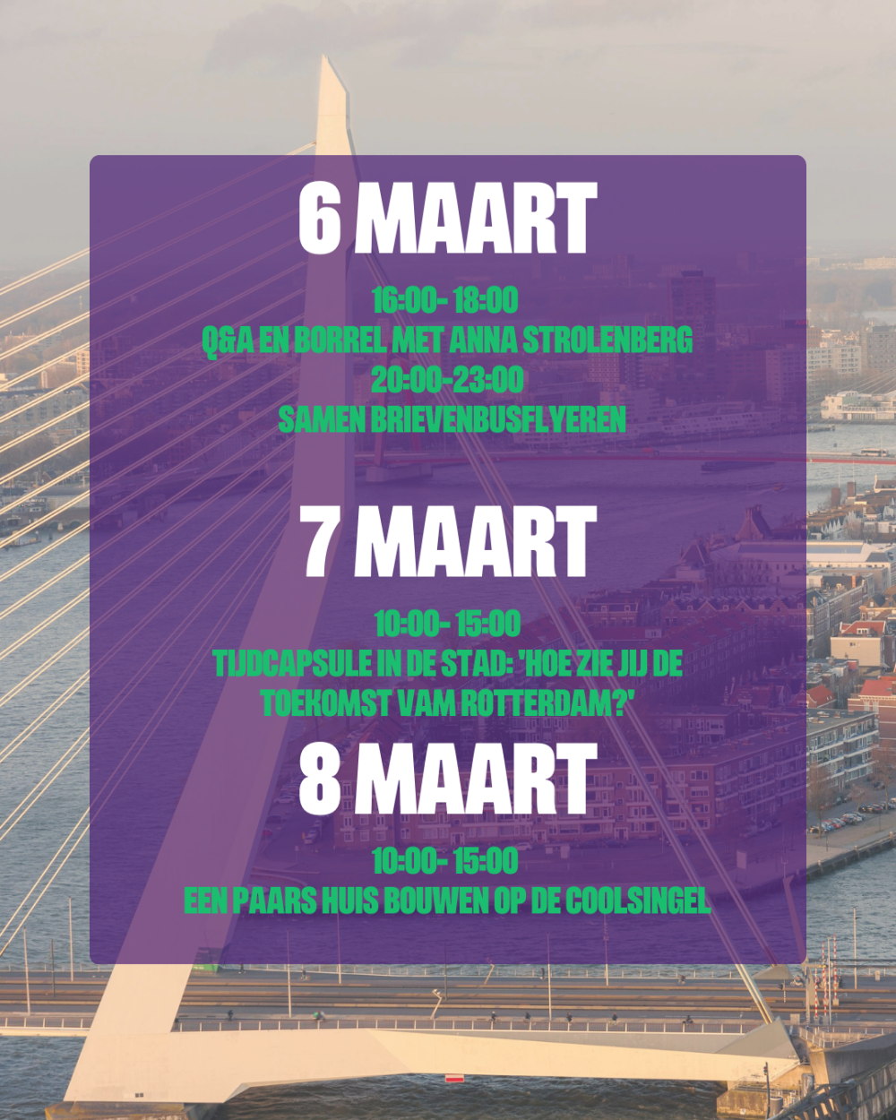 18 maart zijn de gemeenteraadsverkiezingen. Daarom staat maart in het teken van campagne voeren & Rotterdam paars kleuren! In het campagne weekend van 6 tot en met 8 maart zijn de volgende acties: