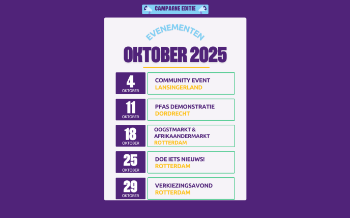 Hiernaast een overzicht van alle campagne acties deze maand. Elke zondag zullen we gaan flyeren in een wijk. Zelf (brievenbus)flyeren mag natuurlijk ook altijd! Neem contact op met het bestuur om flyers en posters te ontvangen. Hieronder kan je per activiteit meer informatie vinden.