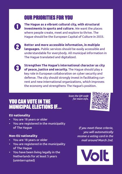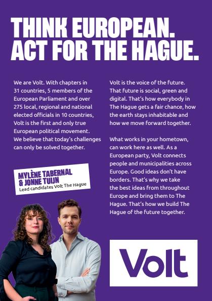 Choosing Volt means supporting a party that values international cooperation, evidence-based policy, and a vision for The Hague as a connected, inclusive European city. For expats, this translates to better housing, stronger community ties, and a local government that understands and embraces diversity. In short, Volt Den Haag is the party that sees the city—and its expat residents—as part of a larger, united Europe. Why not be part of our progressive movement?